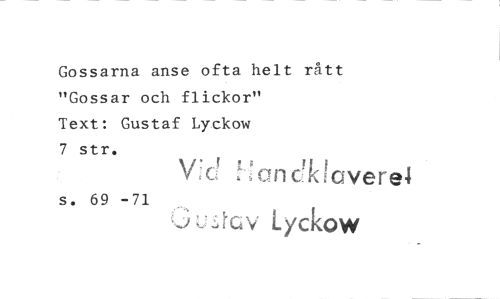 //// Gossarna anse ofta helt rått "Gossar och flickor" //// Text: Gustaf Lyckow //// 7 str. //// V:cti 1 3 an c klaver& //// s. 69 -71 //// tciv Lyckow ////