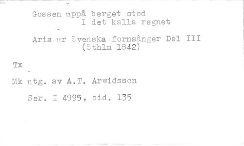 //// Gossen uppå berget stod //// I det kalla regnet //// Aria ur Svenska fornsånger Del III (Sthlm 1842) //// Tx //// Talk utg. av A.T. Arwidsson //// Ser. I 4995, sid. 135 ////