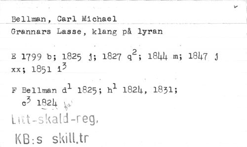 //// Bellman Carl Michael //// Grannars Lasse, klang på lyran //// E 1799 b; 1825 j; 1827 q2; 1844 m; 1847 xx; 1851 i3 //// n //// F Bellman d1 1825; h1 1824, 1831; c3 1824 V //// i Å-skald-Teg, //// KB:s skitUr ////