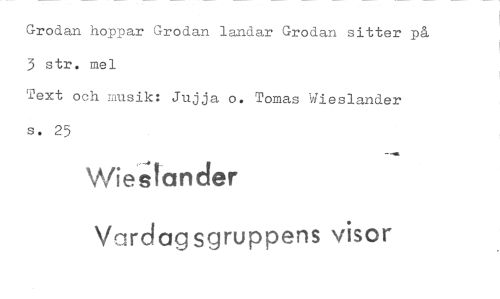 //// Grodan hoppar Grodan landar Grodan sitter på 3 str. mel //// Text och musik: Jujja o. Tomas Wieslander s. 25 //// Wieslander //// Vardag sgruppens visor ////