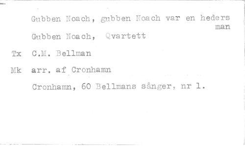 //// Gubben Noach, gubben Noach var en heders //// man //// Gubben Noach, Qvartett //// Tx C. M. Bellman //// Mk arr. af Cronhamn //// Cronhamn, 60 Bellmans sånger, nr 1. ////