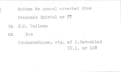 //// Gubben är gammal urverket dras Fredmans Epistel nr 27 //// Tx C.M. Bellman //// Mk D:o //// Studentsången, utg. af I.Hedenblad //// 11.1. nr 110 ////