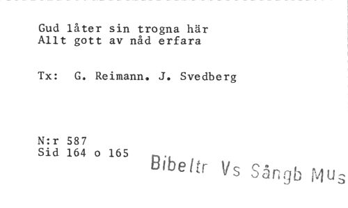 //// Gud låter sin trogna här Allt gott av nåd erfara //// Tx: G. Reimann. J. Svedberg //// N:r 587 //// Sid 164 o 165 Ribeltr Vs Sångb Mus ////