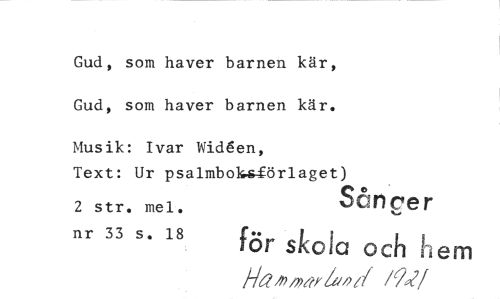 //// Gud, som haver barnen kär, //// Gud, som haver barnen kär. //// Musik: Ivar Wicl6en, //// Text: Ur psalmboks-förlaget) //// 2 str. mel. Sånger //// nr 33 s. 18 för skola och hem //// Ha /PlY teM 1/ /9? //// /
