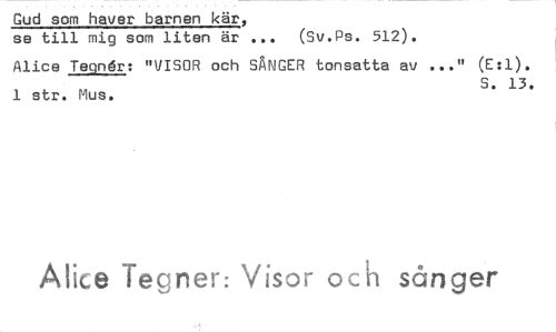 //// Gud som haver barnen kär, //// se till mig som liten är (Sv.Ps. 512). //// Alice Tegnér: "VISOR och SÅNGER tonsatta av ..." (E:1). 1 str. Mus. S. 13. //// Alice Tegner: Visor och sånger ////