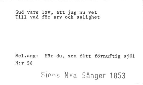 //// Gud vare lov, att jag nu vet Till vad för arv och salighet //// Mel.ang: Hör du, som fått förnuftig själ N:r 58 //// Sions Nya Sånger 1853 ////