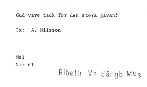 //// Gud vare tack för den stora gåvan! Tx: A. Nilsson //// Mel //// N:r 61 //// Bibelfr Vs Sårgb Mus ////