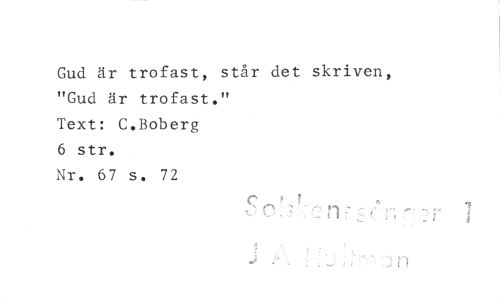 //// Gud är trofast, står det skriven, "Gud är trofast." //// Text: C.Boberg //// 6 str. //// Nr. 67 s. 72 ////