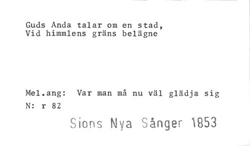 //// Guds Anda talar om en stad, Vid himmlens gräns belägne //// Mel.ang: Var man må nu väl glädja sig N: r 82 //// Sions Nya Sånger 1853 ////