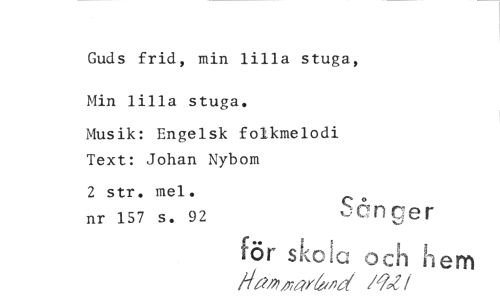 //// Guds frid, min lilla stuga, Min lilla stuga. //// Musik: Engelsk folkmelodi Text: Johan Nybom //// 2 str. n c7er //// nr 157 s. 92 för sko och nem i-1~44d /v //// /