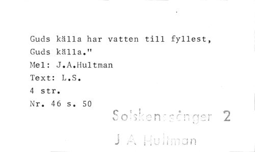//// Guds källa har vatten till fyllest, Guds källa." //// Mel: J.A.Hultman //// Text: L.S. //// 4 str. //// Nr. 46 s. 50 //// sk 4 n ////