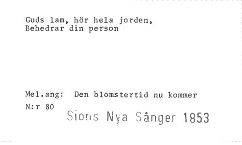 //// Guds lam, hör hela jorden, Behedrar din person //// Mel.ang: Den blomstertid nu kommer N:r 80 //// Sins Nya Sånger 1853 ////
