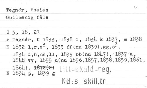 //// Tegnér, Esaias //// Gullmanig fåle //// C3, 18,27 //// F Tegnér, f 1833, 1838 i, 1834 k 1837, m 1838 E 1832 1,r,s3, 1833 ff(nu 1839),gg,c3, //// 1834 d,h,cc,11, 1835 bb(nu 1847), 1837 a, 1848 vv, 1855 u(nu 1856,1857,1858,1859,1861, //// 1864), 1-872t24 //// N 183/4 p, 1839 g skald-Teg, //// KB:s skäl tr ////