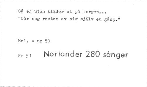 //// Gå ej utan kläder ut på torgen,.. //// "Går nog resten av sig själv en gång." //// Mel. = nr 50 //// Nr 51 Koriander 280 sånger ////