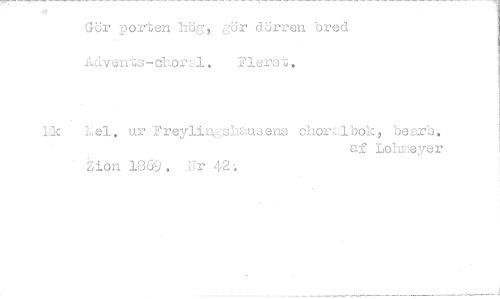 //// Gör porten hög, gör dörren bred Advents-choral. Flerst, //// U Lel, ur Freylingshausens choranok, bearb. //// af Lohneyer //// non 1869, Jr 42: ////