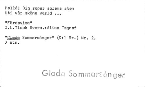 //// Hallå: Dig ropar solens sken Uti vår sköna värld ... //// "Färdevisa" //// J.L.Tieck övers.:Alice Tegnef //// "Glada Sommarsånger" (D:1 Br.) Nr. 2. 3 str. //// G la a Jomrnar-c,,;';nger ////