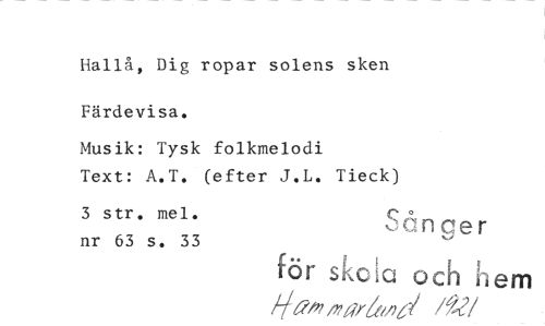 //// Hallå, Dig ropar solens sken Färdevisa. //// Musik: Tysk folkmelodi //// Text: A.T. (efter J.L. Tieck) //// 3 str. mel. Sånger //// för skola och hem //// a/4/27arbdoi /9-J //// /nr 63 s. 33 ////