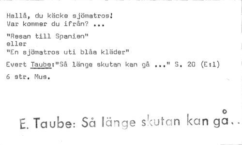 //// Hallå, du käcke sjömatros! Var kommer du ifrån? //// "Resan till Spanien" //// eller //// "En sjömatros uti blåa kläder" //// Evert Taube:"Så länge skutan kan gå ..." S. 20 (E:1) 6 str. Mus. //// 0 //// E. Taube: Så länie itcn kan ga.. ////