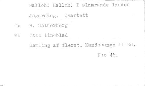 //// Halloh: Hallohl I slumrande lunder Jägarsång. Qvartett //// Tx H. Sätherberg //// Nk Otto Lindblad //// Samling af flerst. Mandssange II Bd. //// I'T:o 46. ////