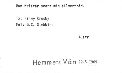 //// Han brister snart min silvertråd. //// Tx: Fanny Crosby Mel: G.C. Stebbins //// 4.str //// Hemmets Vän 22.5.1969 ////