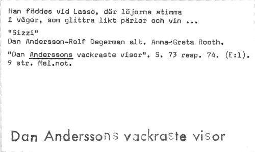 //// Han föddes vid Lasso, där löjorna stimma //// i vågor, som glittra likt pärlor och vin ... //// "Sizzi" //// Dan Andersson-Rolf Dagerman alt. Anna-Greta Rooth. //// "Dan Anderssons vackraste visor". S. 73 resp. 74. (E:1). 9 str. Mel.not. //// Dan Anderssons vackraste visor ////