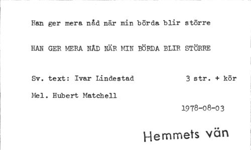 //// Han ger mera nåd när min börda blir större HAN GER MERA NÅD NÄR MIN BÖRDA BLIR STÖRRE Sv. text: Ivar Lindestad 3 str. + kör //// Mel. Hubert Matchell //// 1978-08-03 //// Hemmets vän ////