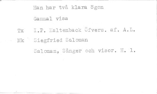 //// Han har två klara ögon Gammal visa //// Tx I.P. Kaltenback öfvers. af. A.L. //// Mk Siegfried Soloman //// Saloman, Sånger och visor. H. 1. ////
