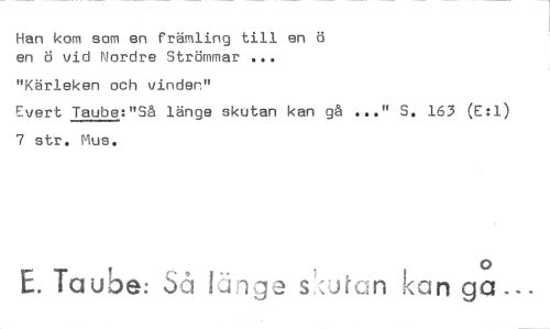 //// Han kom som en främling till en ö en ö vid Nordre Strömmar ... //// "Kärleken och vinden" //// Evert Taube:"Så länge skutan kan gå ..." S. 163 (E:1) 7 str. Mus. //// 0 //// E. Taube: Så länge sbten kan ga ////