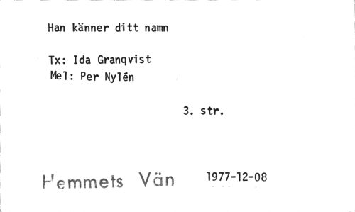 //// Han känner ditt namn //// Tx: Ida Granqvist Mel: Per Nylb //// 3. str. //// Vemniets Vän 1977-12-08 ////