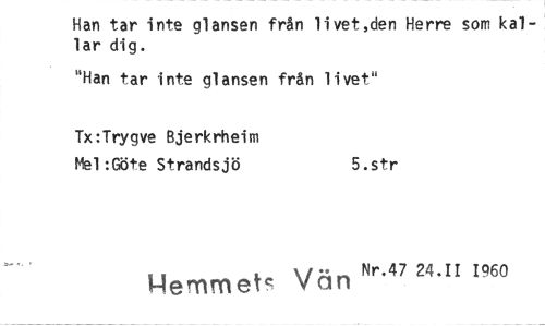 //// Han tar inte glansen från livet ,den Herre som kallar dig. //// "Han tar inte glansen från livet" //// Tx:Trygve Bjerkrheim //// Mel:Göte Strandsjö 5.str //// 1-lemme Vän Nr.47 24.11 1060 ////