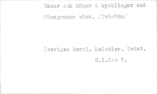 //// Hanar.odh hönor å kycklingar små Hönsgumman visa. /Tvåstäm //// /Sveriges herrl. Melodier. Tvåst. //// H.1.N:o 5. ////