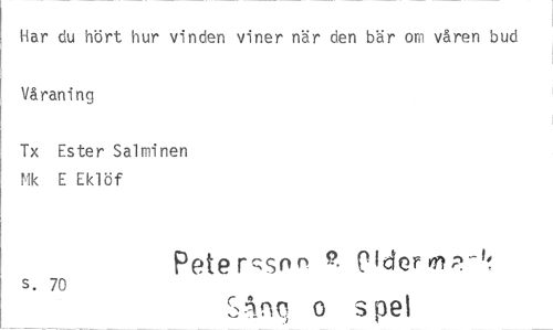 //// Har du hört hur vinden viner när den bär om våren bud Våraning //// Tx Ester Salminen Nk E Eklöf //// s. 70 Peters Cideryn;r1s. //// S-Ang s pei ////