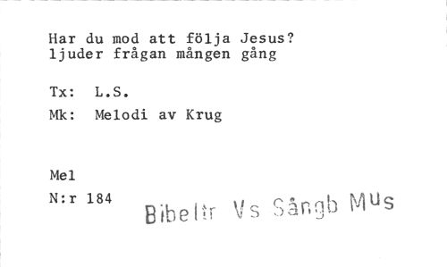 //// Har du mod att följa Jesus? ljuder frågan mången gång //// Tx: L.S. //// Mk: Melodi av Krug //// Mel //// N:r 184 Bibel r Sångb Mus ////