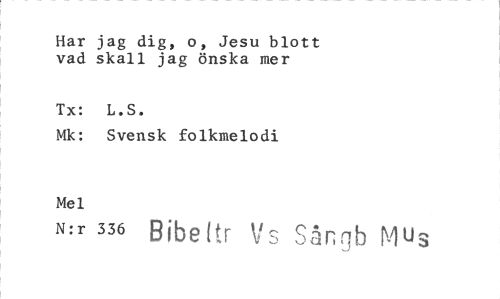 //// Har jag dig, o, Jesu blott vad skall jag önska mer //// Tx: L.S. //// Mk: Svensk folkmelodi //// Mel Sångb Mus //// N:r 336 Babe i • Li tj ////