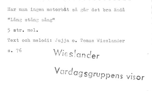 //// Har man ingen motorbåt så går det bra ändå "Lång stång sång" //// 5 ztr. mel. //// Text och melodi: Jujja o. Tornas Wieslander //// s. 76 Wie siander //// Vordagsgruppens visor ////