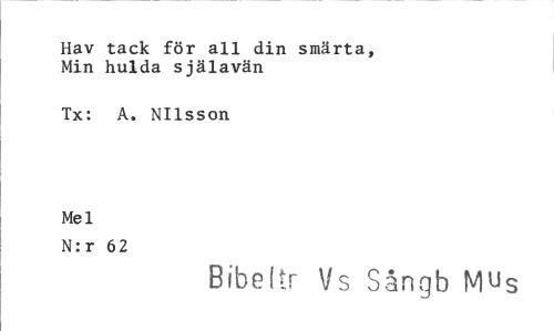 //// Hav tack för all din smärta, Min hulda själavän //// Tx: A. NIlsson //// Mel //// N:r 62 //// Bibettr Vs Sångb Mus ////