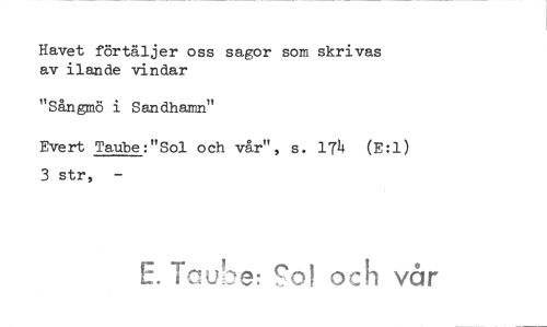 //// Havet förtäljer oss sagor som skrivas av ilande vindar //// "Sångmö i Sandhamn" //// Evert Taube:"Sol och vår", s. 174 (E:1) 3 str, - //// E. Taube: Sol och vår ////