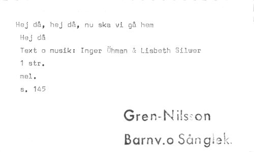//// Hej då, hej då, nu ska vi gå hem //// Hej då //// Text o musik: Inger Öhman å Lisbeth Silwer //// 1 str. mel. //// s. 145 //// Gren-N ik,on //// Barnv.o Sån g..9! ////