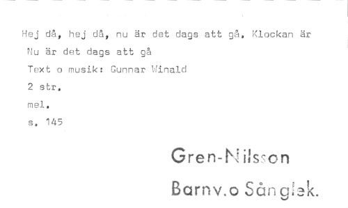 //// Hej då, hej då, nu är det dags att gå. Klockan är Nu är det dags att gå //// Text o musik: Gunnar Winald //// 2 str, //// mel. //// s. 145 //// Gren-Nilsson //// Barnv.o Sån c:nk. ////