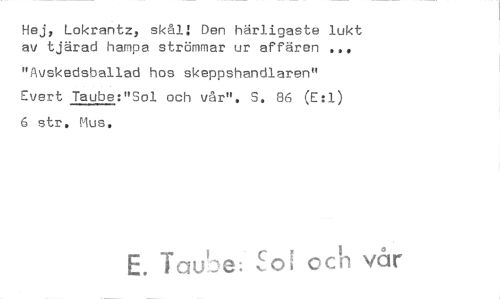 //// Hej, Lokrantz, skål: Den härligaste lukt av tjärad hampa strömmar ur affären ... //// "Avskedsballad hos skeppshandlaren" Evert Taube:"Sol och vår". S. 86 (E:1) 6 str. Mus. //// E. Taube: 5:06 och vår ////