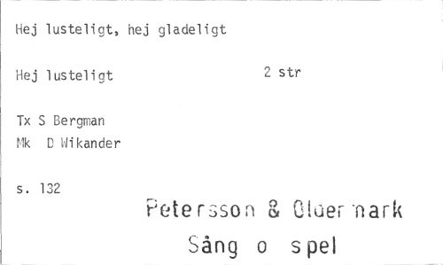 //// Hej lusteligt, hej gladeligt Hej lusteligt 2 str //// Tx S Bergman Nk D Wikander //// s. 132 //// Petersson & Cl(A•r .nark //// Sång o spel ////