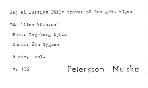 //// Hej så lustigt Pålle travar på den gråa vägen //// "En liten körsven" Text: Ingeborg Björk Musik: Åke Nygren //// 5 str. xael. //// s. 136 Petersson Nu StK ////