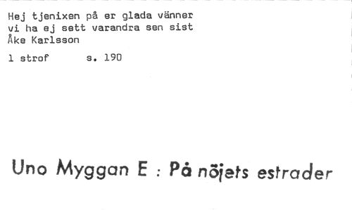 //// Hej tjenixen på er glada vänner vi ha ej sett varandra sen sist Åke Karlsson //// 1 strof s. 190 //// Uno Myggan E : På najats estrader ////