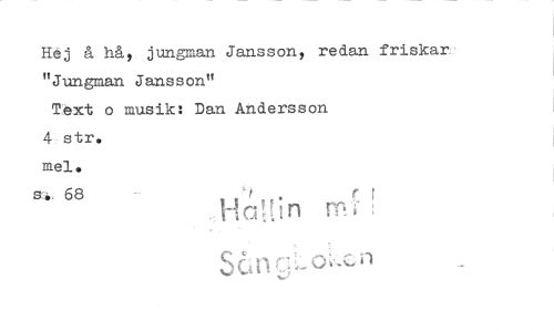 //// Hej å hå, jungman Jansson, redan friskar: "Jungman Jansson" //// Text o musik: Dan Andersson //// 4 str. //// mel. //// 68 //// Hat in m //// o //// c n o n //// zi ////