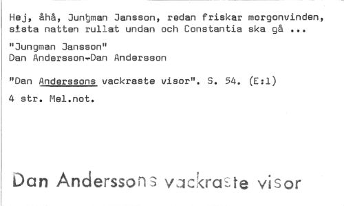 //// Hej, åhå, Junbman Jansson, redan friskar morgonvinden, sista natten rullat undan och Constantia ska gå ... //// "Jungman Jansson" //// Dan Andersson-Dan Andersson //// "Dan Anderssons vackraste visor". S. 54. (E:1) 4 str. Mel.not. //// Dan Andersson v4ckrate visor ////