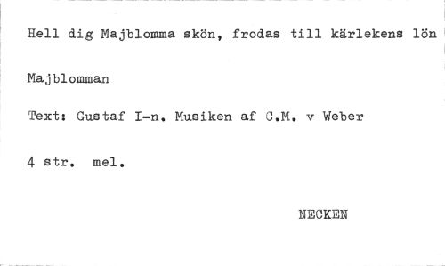 //// Hell dig Majblomma skön, frodas till kärlekens lön //// Majblomman //// Text: Gustaf I—n. Musiken af O.M. v Weber //// 4 str. mei. //// NECKEN ////
