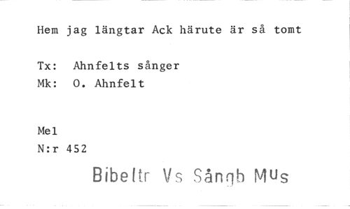//// Hem jag längtar Ack härute är så tomt //// Tx: Ahnfelts sånger Mk: 0. Ahnfelt //// Mel //// N:r 452 //// Bibeltr Vs Sångh Mus ////