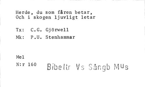 //// Herde, du som fåren betar, Och i skogen ljuvligt letar //// Tx: C.G. Gjörwell Mk: P.U. Stenhammar //// Mel //// N:r 160 Bibeltr Vs Sångb Mus ////