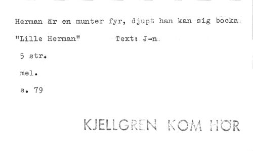 //// Herman är en munter fyr, djupt han kan sig bocka. "Lille Herman" Text: J-n //// 5 str.. //// mel. //// s. 79 //// KIEL OM ////