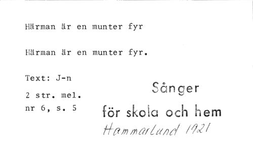 //// Härman är en munter fyr Ilärman är en munter fyr. Text: J-n //// 2 str. mel. Sånger //// nr 6, s. 5 för skola och hem //// 1117? Iv /Var (1Y /2d 2 11 ////